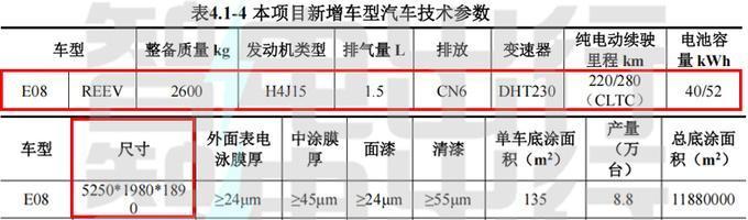 E08提供2种续航版本,分别匹配40kWh、52kWh电池组,对应CLTC工况纯电续航220km、280km,整备质量2600kg。